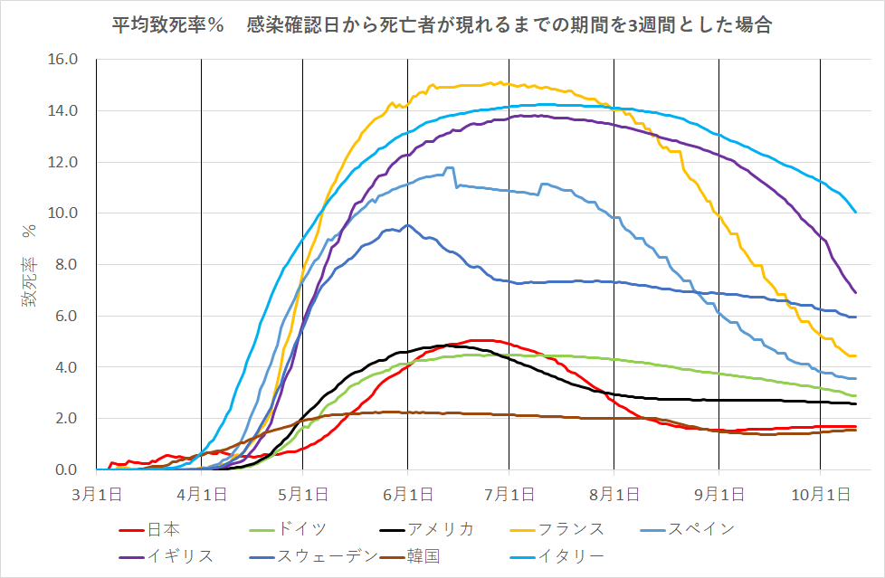 韓国は、制限なくPCR検査をして擬陽性者を含め強制隔離をしたために致死率が下がっているとみられなくもない。