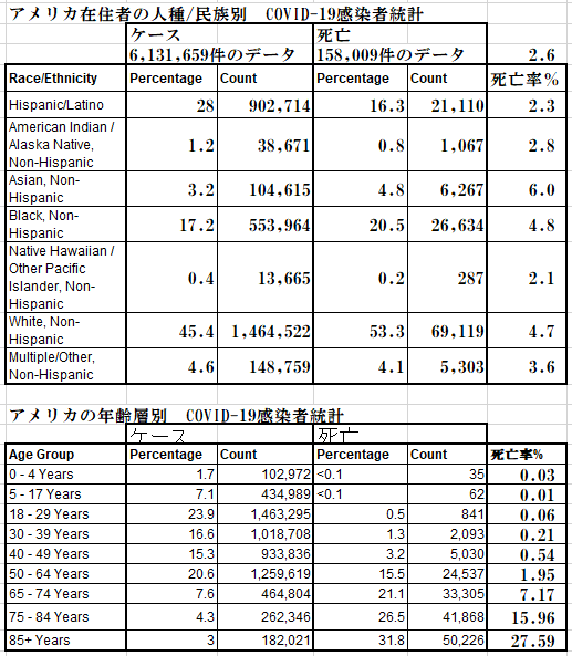 ヒスパニックを除く白人およびアフリカ系黒人の死亡率が高いのは世界の感染統計からある程度予想される。