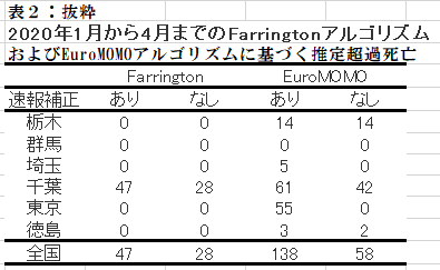FarringtonアルゴリズムとEuroMOMOアルゴリズムはどちらも既に実証、確立、実用されている手法であり、妥当性に関する優劣はつけ難い。Farringtonアルゴリズムのほうが保守的な結果、つまり超過死亡が出にくくなる統計的な計算結果が返されることが認められた。一方でEuroMOMOアルゴリズムは比較的に超過死亡は出やすくなる。これらのことを勘案し、両アルゴリズムの結果の間に真の超過死亡数があるだろう、と結論付けるのが良いと考える。