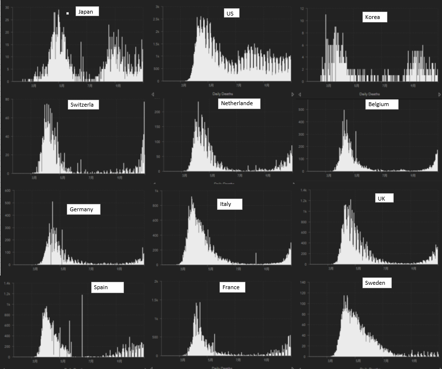 不思議なことに社会的感染対策の異なる日本とアメリカのパターンが似ているように見える。両国とも第2波が終わらない内に第3波に移ろうとしているか? 韓国は第2波が収束。