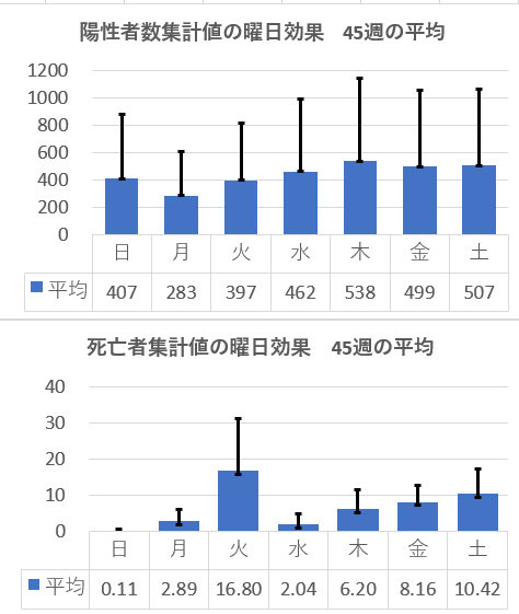 COVID-19感染が確認されてからの全期間45週について、平均をとった曜日効果は下のグラフに見ることが出来る。エラーバーは平均の回りの標準偏差で下側を省略して描いた。陽性者数のエラーバーが大きいのは期間中感染者数の変動が大きいためである。