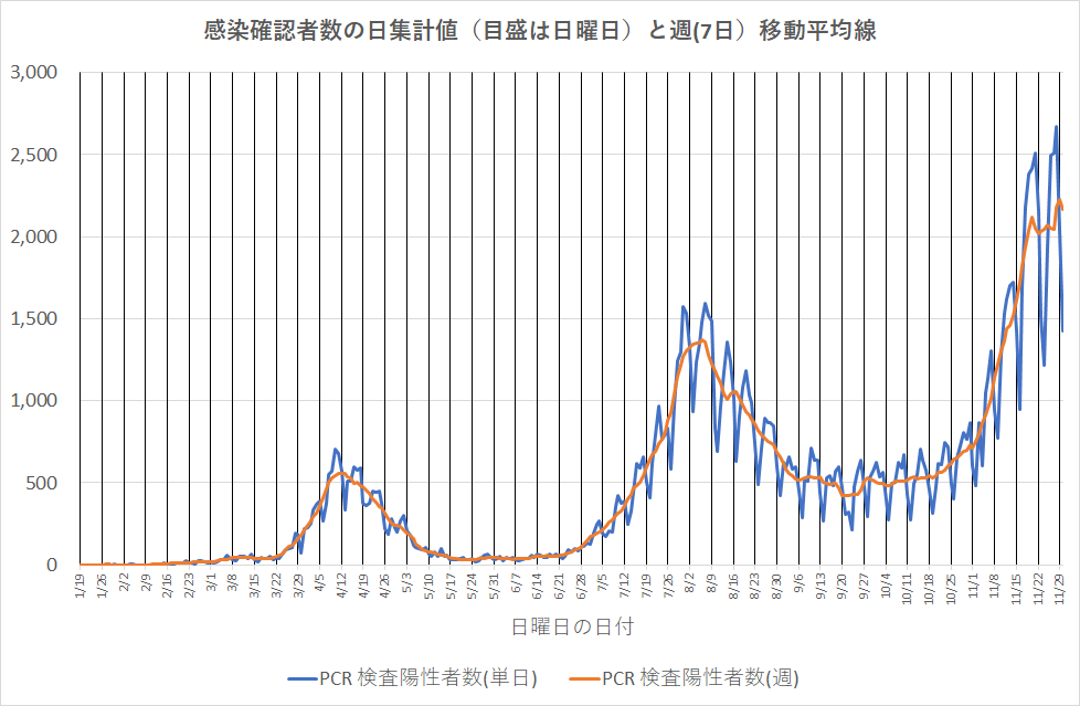 下のグラフは厚生労働省のデータベース・オープンデータで描いた感染確認者数の日毎集計値である。社会性活動は曜日で周期的に変化する要素が多く、このグラフでは感染確認者数を、毎日曜日の日付とともに日経過を横軸にして記載した。感染確認者数の集計値は、週内の曜日により周期的な変動を強く受けていることが分かる。この効果を避けるためには、グラフの赤線のように週間(7日)移動平均を取りその中央値で見ることが必要である。これが増減を示す科学的意味のある値となる。下のグラフに見るように、少なくとも日本では現在までこの周期性を大きく外れた異常な感染爆発は記録されていない。