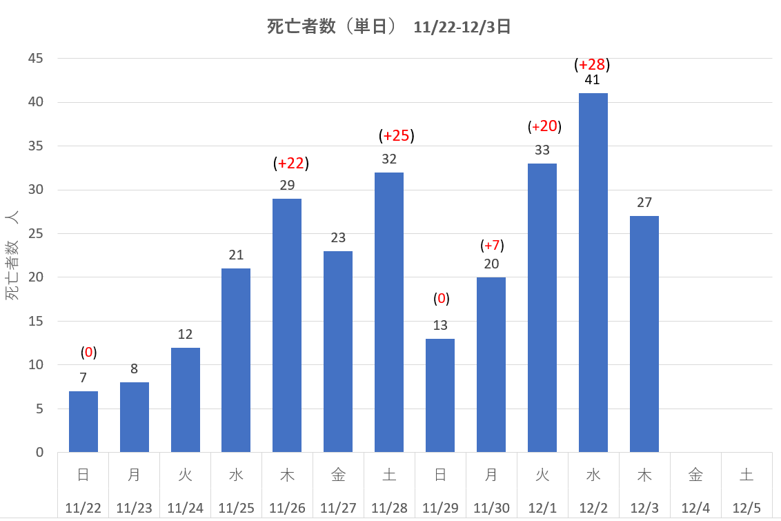 赤字は日曜日からの死亡者の増加数を示した。4日間の期間の取り方によっては返って減少している場合も見える。このような誤りを除くために普通は週(7日)間移動平均を用いて日毎の変化量を推定している。