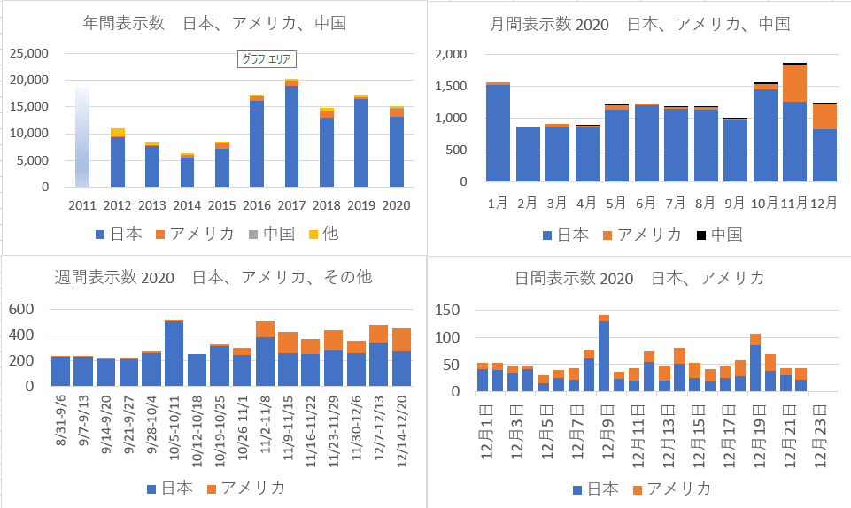 日本語で書いた私のブログ、当然のことながら圧倒的に日本の表示数が多いのは当然と思っていた。しかし今年11月からアメリカの表示数が増え始め、終日アメリカの方が多い日が見られるようになった。この統計表からだけでは、特定の方が私の記事の各タイトルを順次見ていただいているのかとも思われるが、日本では、COVID-19に関し書き始めてからも交通事故関係のタイトルの表示数に比べ、コロナウィルス関係のタイトルの上昇は思ったより少ない。なぜだろう。直前のブログ記事参照。