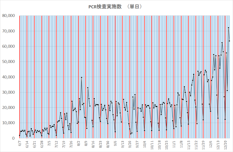 下のグラフは、PCR検査実施数、陽性確認者数、死亡者数をそれぞれ、日毎の厚労省のオープンデータにより描いたものである。縦目盛り線の赤色は日曜日を示す。これを見れば分かるように公表値は、週日活動変化に依存し、感染情報実係数の日系列ではない。