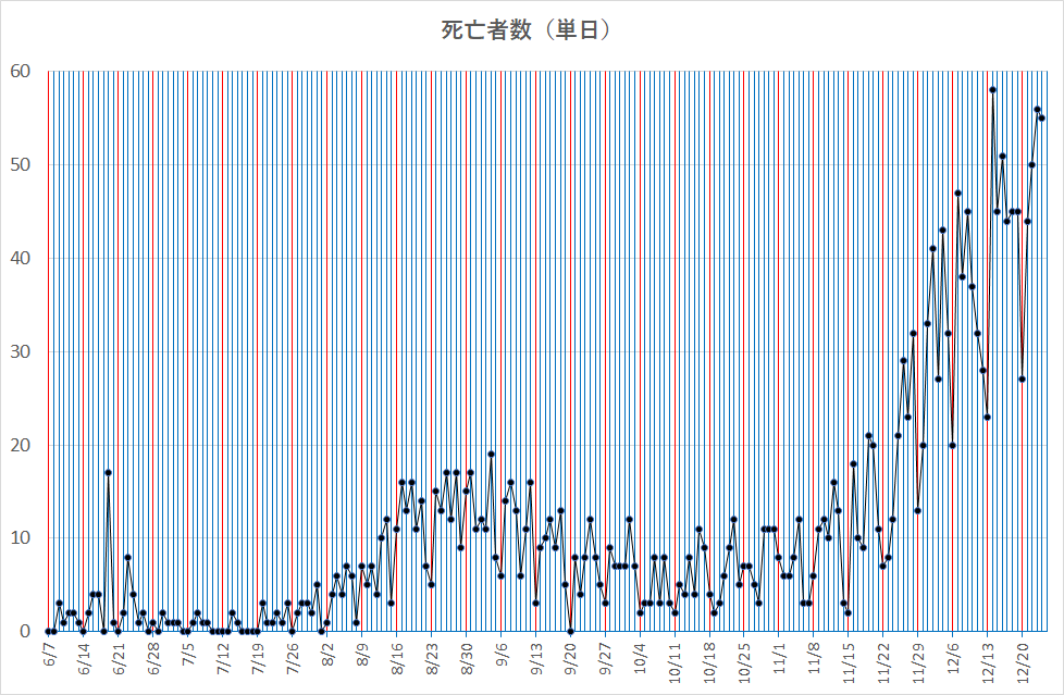 公表されている前日との比較数の主要ファクターは、この曜日の特性を表している数値に過ぎないことが分かる(特に月曜日)。しかも前日までの総集計値に対する増加数では、当日の発生がゼロでない限り増加数することになる。そして、日曜日には調査あるいは集計活動が鈍ることから、前日比で見れば月曜あるいは火曜日の増加が大きく見えるだけであり、事実とは関係のない値である。このような「週バイアス」に無頓着なデータの公表は無意味であるのみならず、一般に誤った認識を醸成するだけであることが分かろう。