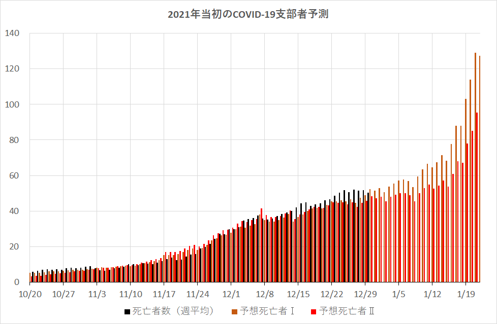 グラフの黒棒は、報告された日死亡者数を週間(7日)移動平均にした日当たりの死亡者数。橙と赤色が私の二つの試算による予測死亡者数。残念ながら云うことなし。