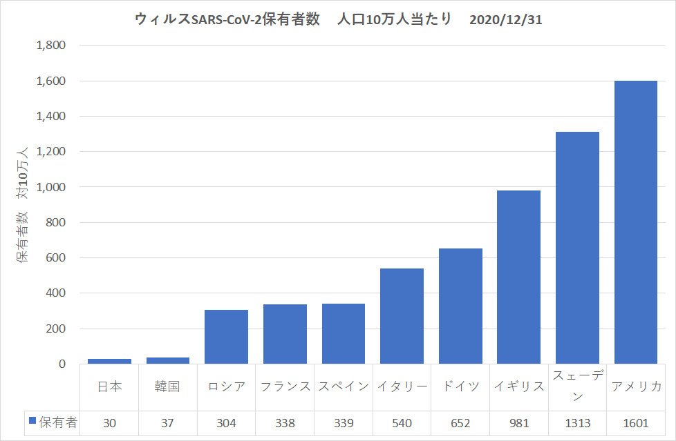下のグラフは、2020年12月31での越年感染活性者人数の推定値で。人数は各国の人口10万人当たりの数で表した。