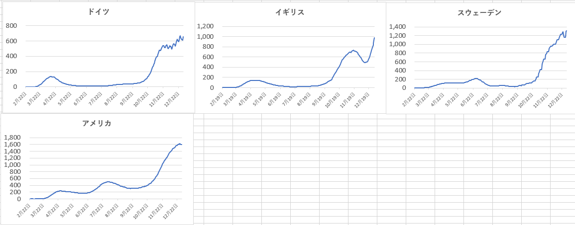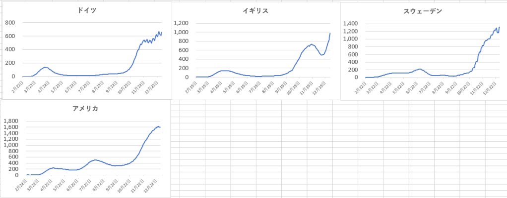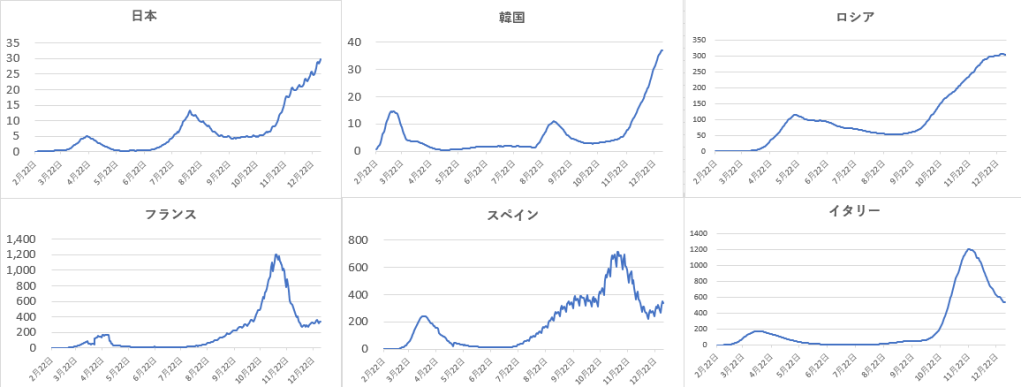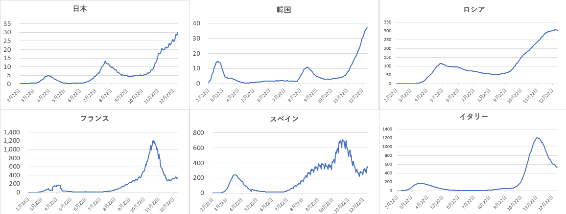 特徴的な違いとして、日本、韓国、アメリカは現在第3次パンデミックに入っているとみられるのに対し、ヨーロッパ諸国は第2次の感染拡大期と見られることである。