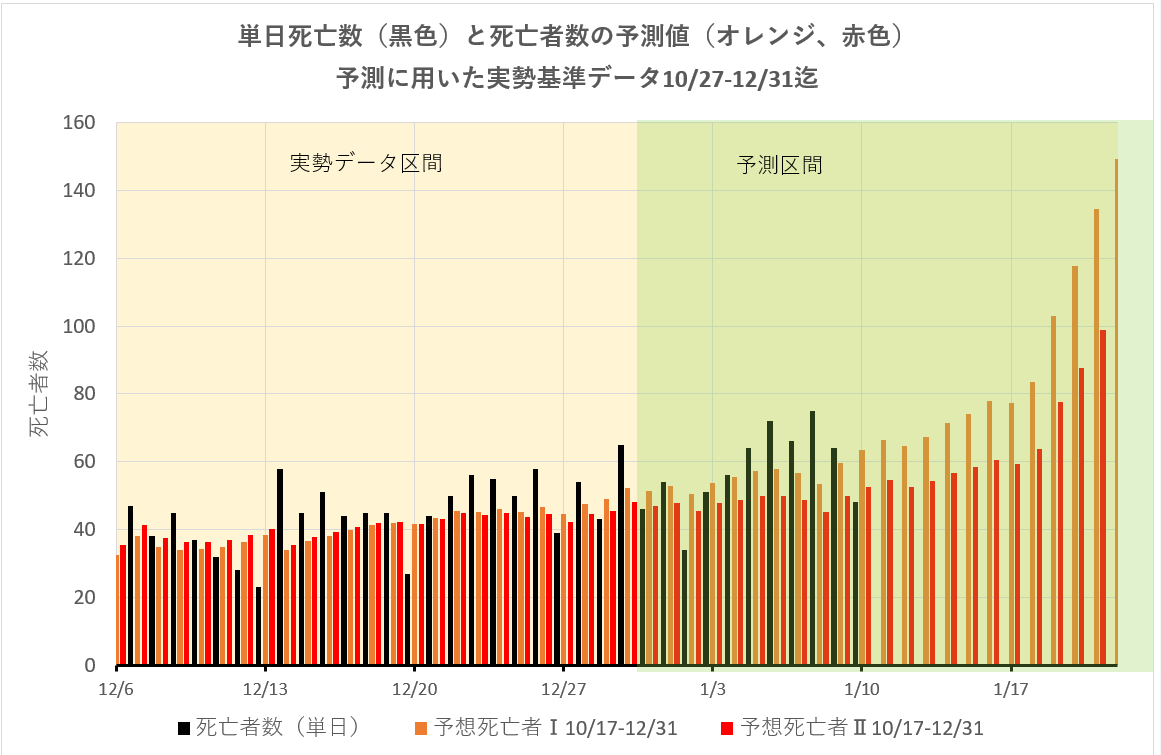以前のブログに示した予想方式で、2020年10月27日から12月31日までの厚労省オープンデータを用いて行った、2021年1月1日から21日までの死亡者予測データと昨日10日までに集計された実勢死亡者数との比較グラフ。