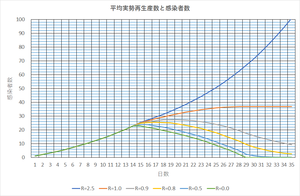 最初の14日間に一人の感染者から感染させられた累積人数は23名になり、その後は15日以前の感染者から他の感染活性がなくなり非再生生産者となる。したがって、もし14日後の時点で感染者をすべて隔離し、以後新たな感染者を発生させないとすれば28日後には感染活性者がいなくなり自然終息をすることになる(緑線)。実効再生産数とも言えない、既存の定義にはないと思うが「実勢再生産数」とも言える係数を考えそれを15日以後に適用してみる。これが1.0の場合、28日以降積算感染者数は、14日前の回復者と死亡者が新たな感染者と同数となり、14日間の移動積算感染者数は一定となる(赤線)。発生14日以後、あらゆる方法で新たな感染確率を下げることに成功し、90%から50%まで順次見てくると、確率を半分以下に下げれば実質収束に向かうと見られる。