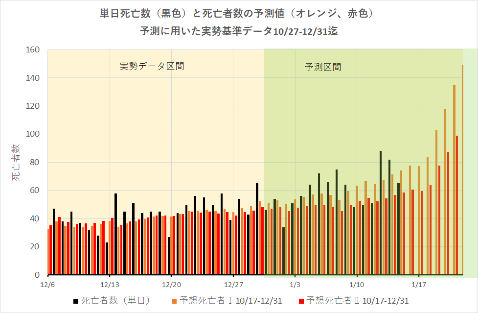 10月27日から12月31までの第3次COVID-19感染増加陽性者数推移より予測した2021年1月15日までの実勢死者数と予測死者数の関係を示す。