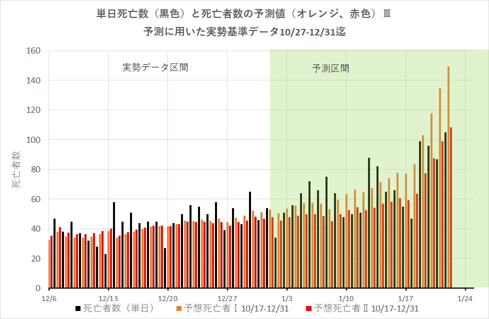 偶然かもしれないがかなり良い近似で終わった。1月1日から22日までの各系列の平均で見ると、実死亡者数が日平均で、67(SD19)名、予想Ⅰが75(SD27),予想Ⅱが60(SD18)。幸い私の予測の最大値より実際の死亡者は少なくて済んだ。