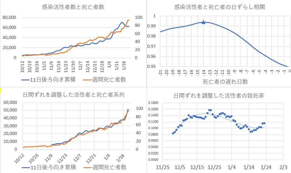 下の組みグラフ上段左は、当日より後ろ向きに11日間の集積陽性者数(感染活性者数)の日系列曲線とその後に現れる死亡者の週(7日)移動平均の日系列曲線を示したものである。両曲線の間には日にちずれ(日ラグ)が見られる。このずれ日数を求めるために、感染活性者数トレンドと死亡者数トレンドの日ずらし相互相関係数を求めたものが右グラフである。活性感染者集団に対する死亡者の週移動平均は14日後に発生する確率が一番大きいことが分かる。