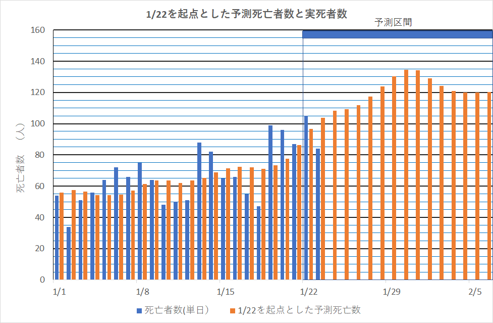 この予測では、1月末から2月初めが死亡者のピークで以後下降に向かうとの希望的に傾向を見ることが出来よう。