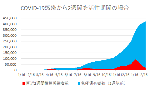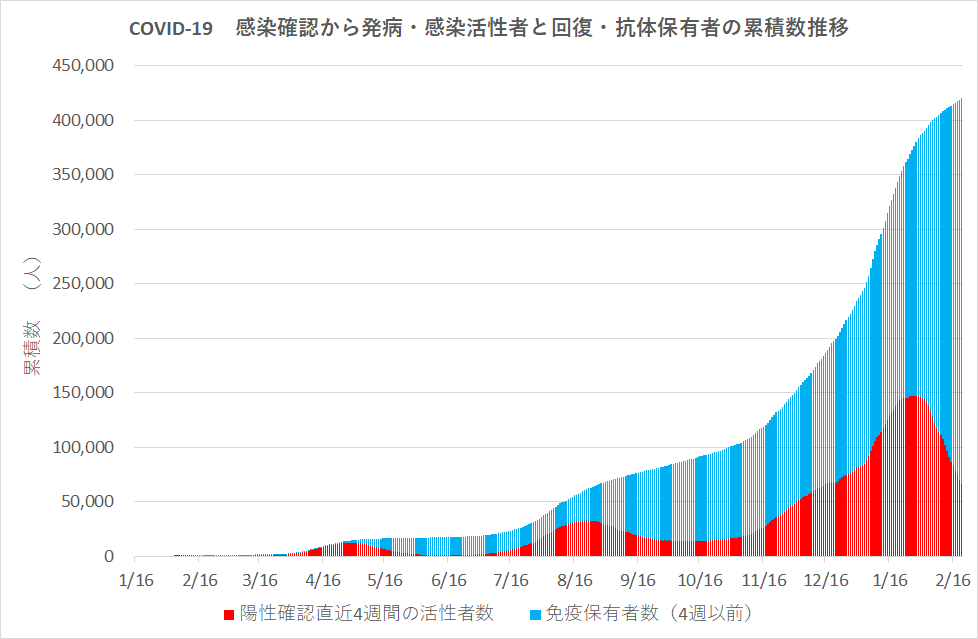 下のグラフは、COVID-19 新型コロナウィルス感染確認者累積数の、直近4週間を活性感染者(他に感染の恐れ、発病の可能性、重症・死亡の恐れのある期間)とし、感染から4週間以上たった免疫抗体保有者の累積数を表したものである。