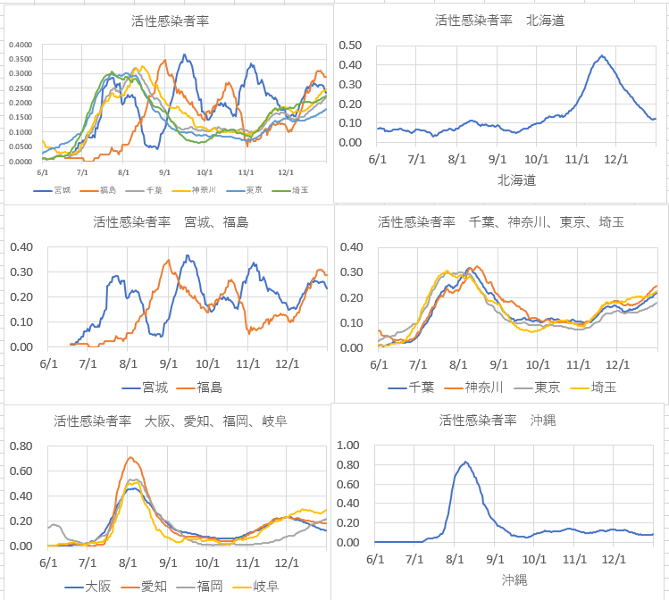 これで見ると、関東4地域は人口が多い為感染者数で見ると目立つが、基本的には西日本の特徴とそれほど変わらない。東日本、福島と宮城は特徴的な変動が見られ異質のように見える。北海道は11月から12月にかけピークが見られる。関東から南では8月にピークが見られている。愛知、沖縄でこのピーク値が高いのは第一次感染拡大が少なかったためである。これも何らかの原因があるとみるべきであろう。