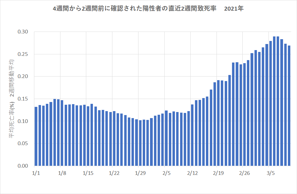このグラフで見る限り、2月第2週から死亡率が上昇し始めたことは、死亡率が高いといわれる変異株感染者の割合が増加し始めたのは1月後半からと見られる。もちろん、これだけで判断するのは根拠薄弱だが。