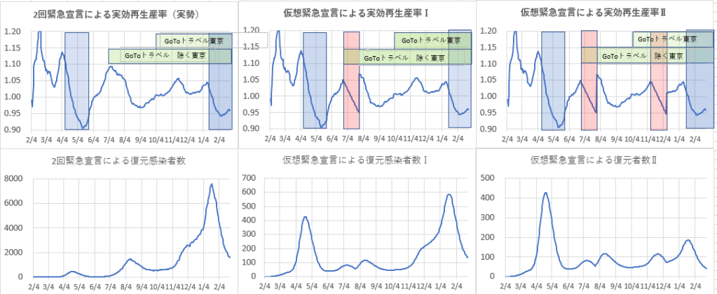 上段のグラフで、水色のぬりつぶし方形は実際に発令された緊急事態宣言、ピンク色の方形はもし発令されたとする仮想緊急事態宣言を表す。