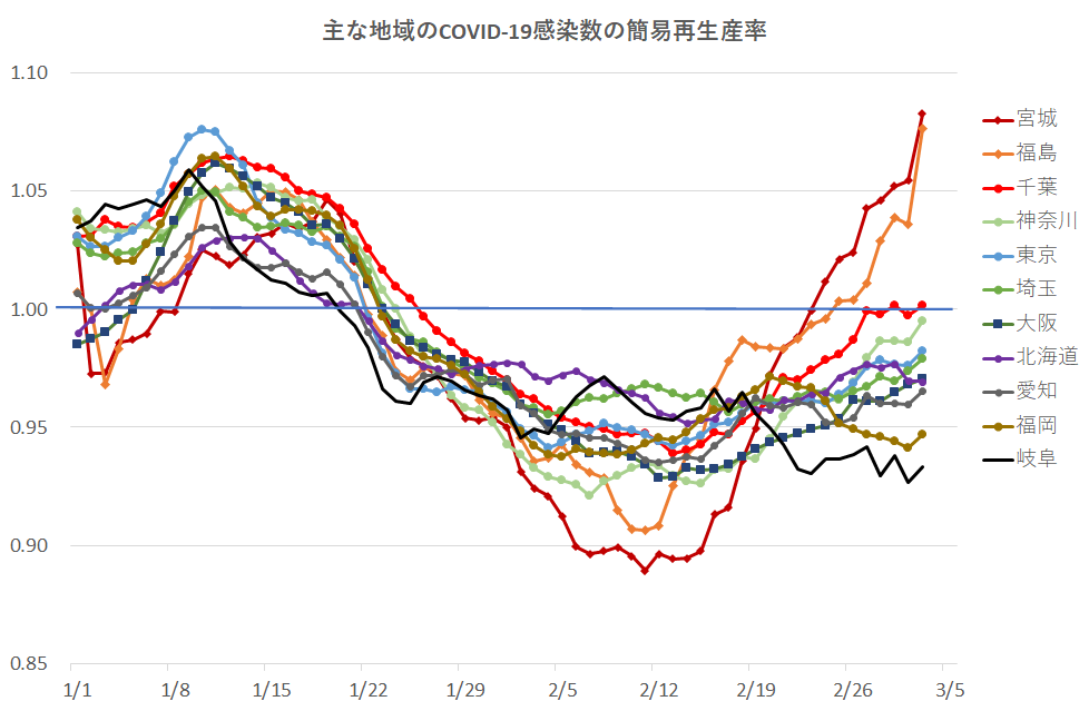 COVID-19感染 宮城・福島で上昇中 簡易再生産率で見る日本の主な地域の状況