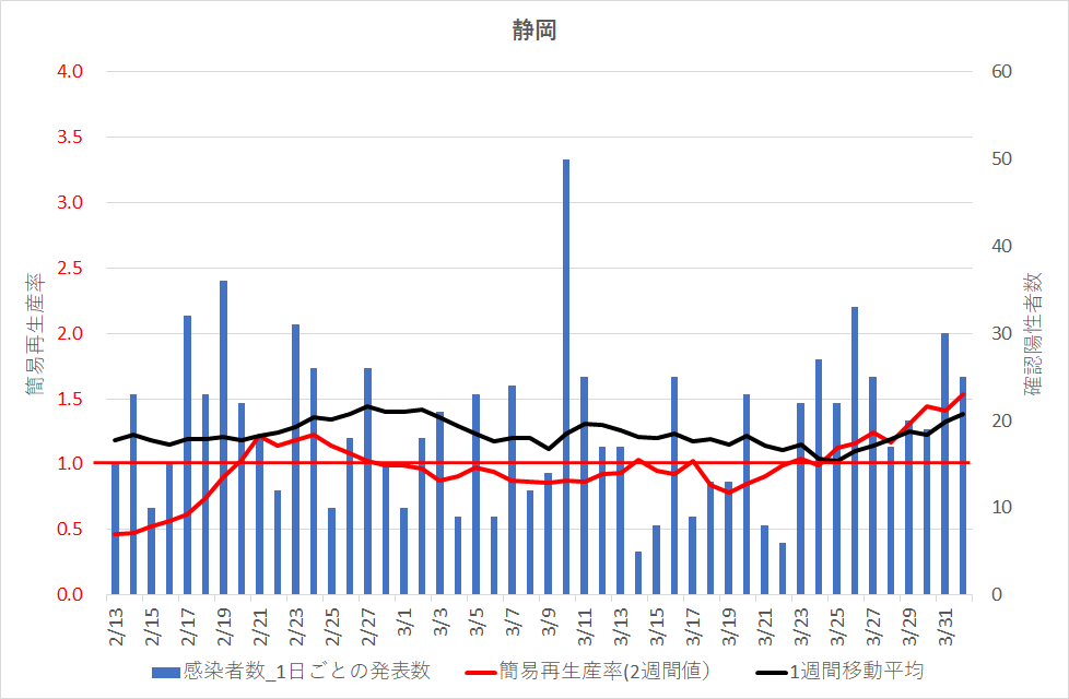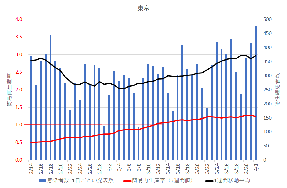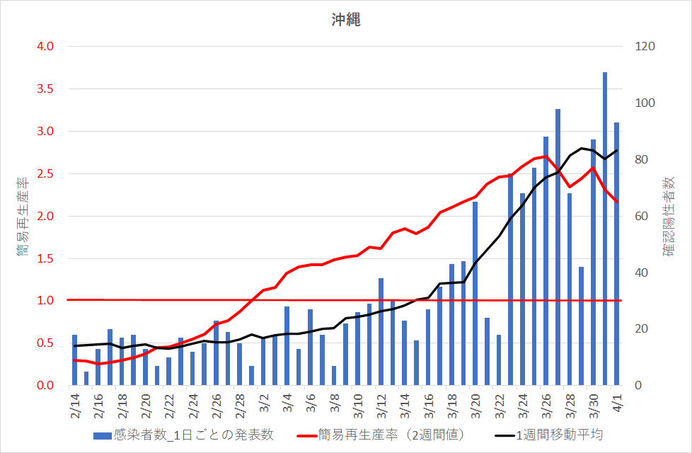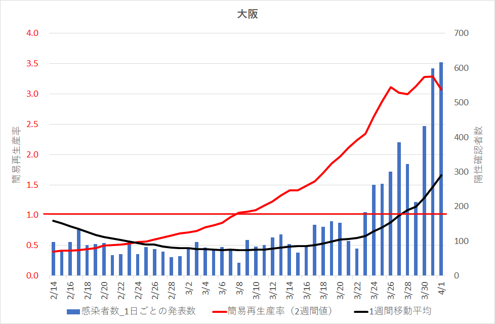 この「簡易再生率」が2以上になるのは脅威的数値であり、一人の既感染者が、次の2週間の間に2名の新しい感染者を生むことである。