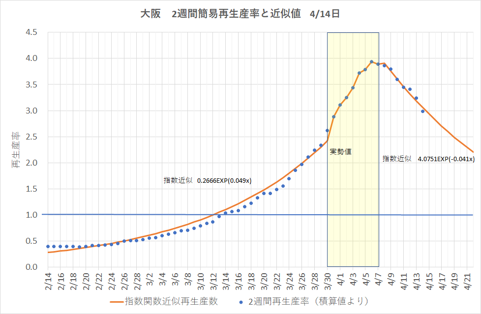 下のグラフはこうして求めた簡易再生産率の指数関数近似値を求めた。結果は、3月30日から4月67日の間では関数近似が困難な上昇を示したので実勢値を、4月8日以後は予測の為指数関数近似式とその外挿値を描いた。