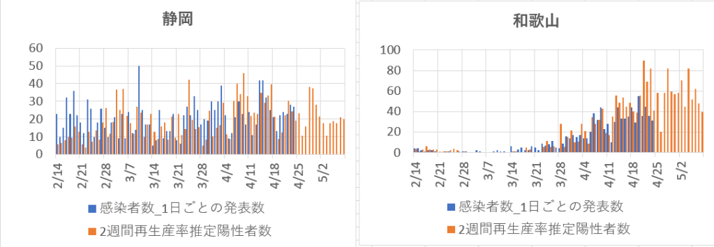下のグラフは、政府に頼らず感染増加を防いでいる静岡県、対策の進んでいる和歌山県の場合。