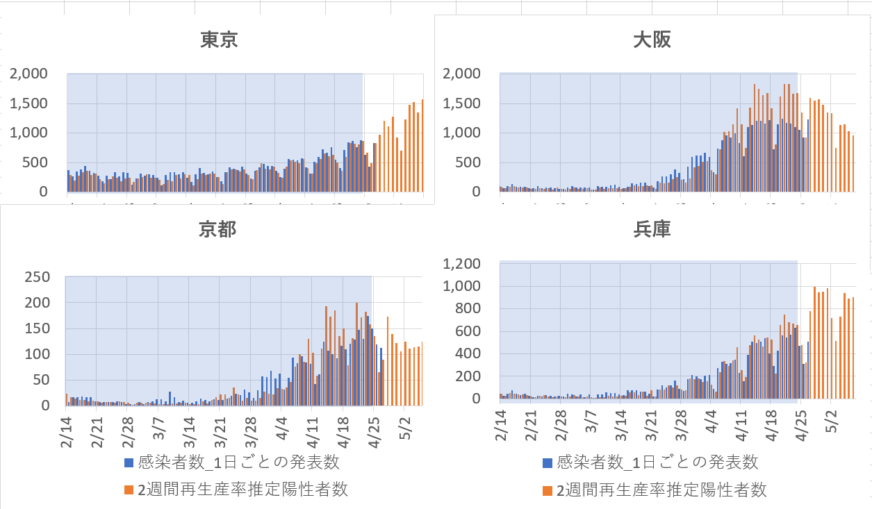 感染者数が安定していた2月14日以降4月24日までのデータを用いて5月8までの予測を表示してみた。データはNHK収集のデータベースより。