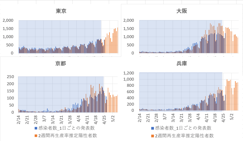 薄青色の塗りつぶし領域は、緊急事態宣言前のデータで予測に用いた陽性確認者数とその予測値推移。