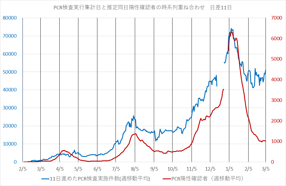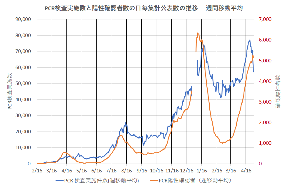 記録初期から第3次までの拡大収束期間、3月5までで見るとPCR検査実施数の日系列曲線の位相が感染確認者曲線より遅れて表れている事が分かる。PCR検査が本来の目的で行われているならこんなことはありえない。しかしグラフ処理の間違いでないことは確かめている。なお、年末年始にかけては通常とは異質な行政事務状態の結果でありデータから除外する事にした。