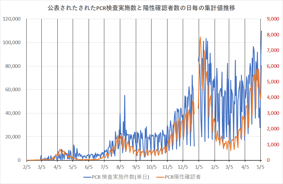 この理由は、日本ではPCR検査が任意ではなく厚労省の検査基準で行われていることによる効果である。すなわち、PCR検査を受けられる一般市民は、発熱が4日以上続く発症者又は感染発病者と密接な接触を証明されたものに限ることに関連する(この制限は後に一部改善されたが)。この証拠に、本来一定であるべきPCR検査実施数の日次変動が大きく、且つ陽性確認者数に依存していることから明らかである。社会の感染者を見出すためのPCR検査実施数なら人口に対し一定割合で継続して行われるべきである。