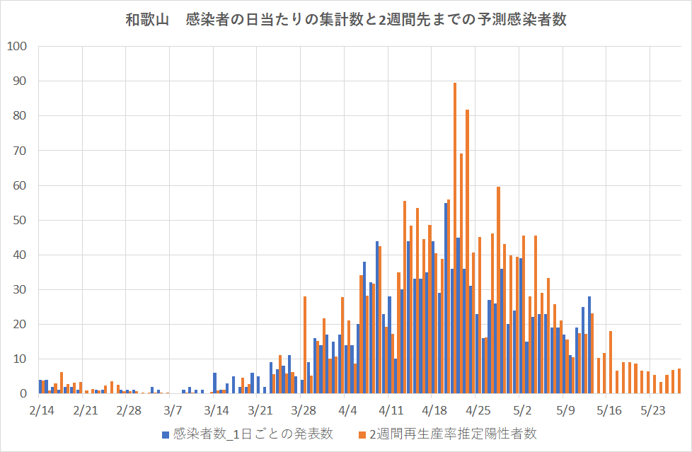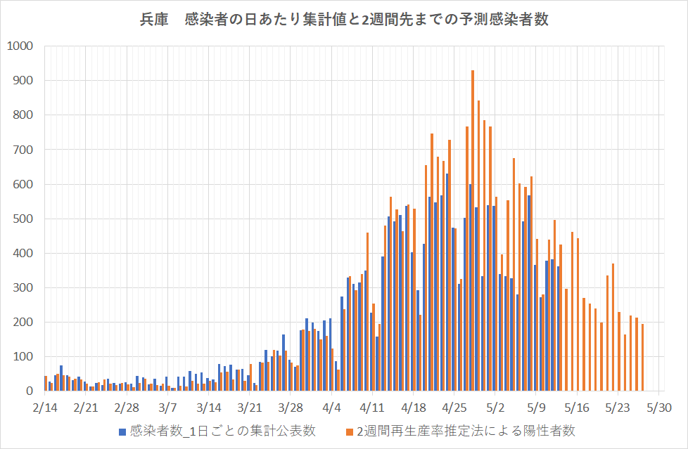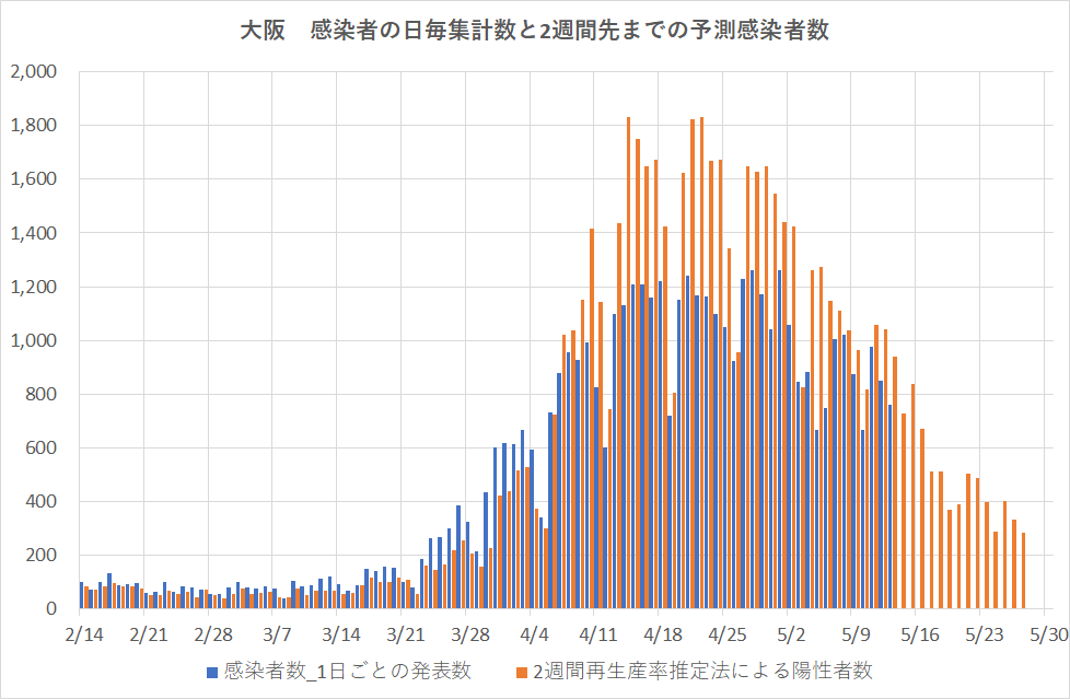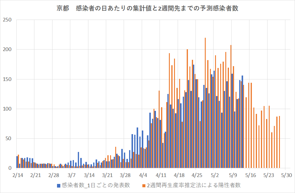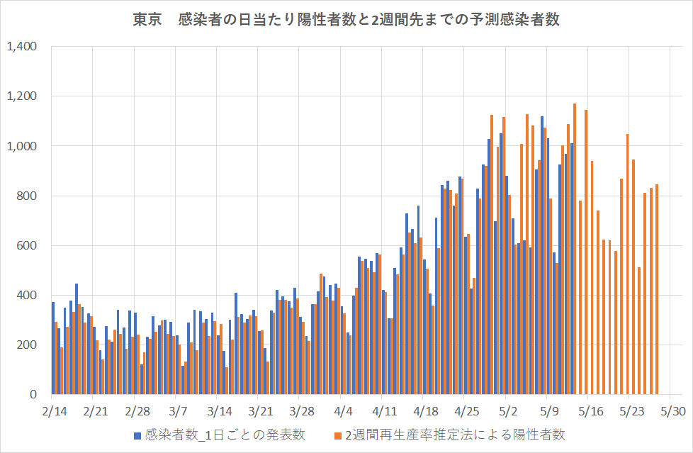 下のグラフで、5月13日までの日ごと感染者の集計値(青棒)と予測計算値(オレンジ棒)の状況を表している。