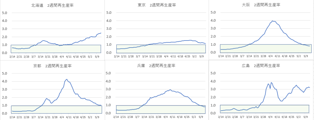 東京、大阪、京都、兵庫はすでに感染拡大期を過ぎ、抑え込みに成功していると見える。今までニュースに出なかった北海道、広島などが拡大中であることが分かる。これは一例であり他は計算していないが。