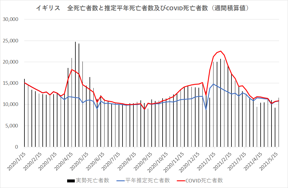 イギリスの場合、平年の推定死亡者数にCOVOD-19感染死亡者数を足した数は、ほぼ2020以降の層死亡数と近似している。