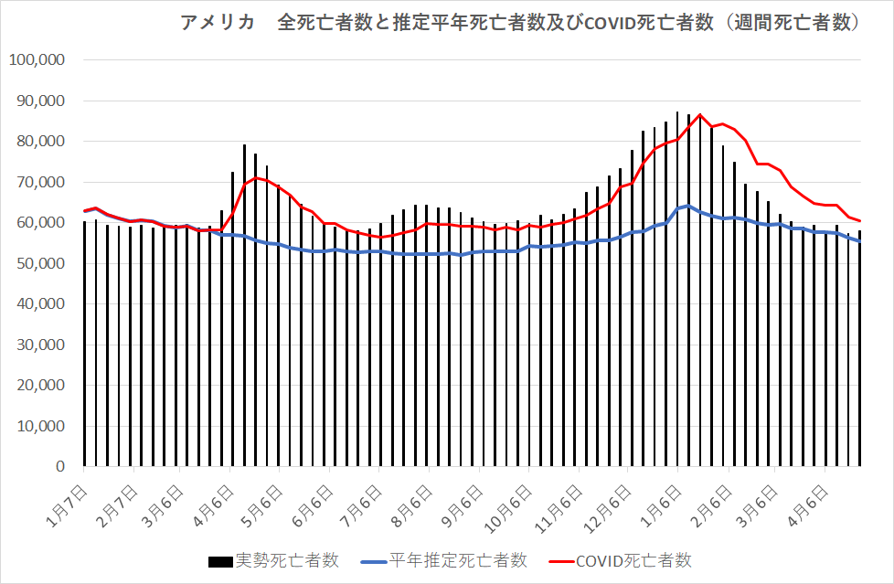 それに比べ、下の2枚のグラフは、イギリスと、アメリカの場合で、平年の死亡者数に比べCOVID-19死亡者が多いことが分かる。