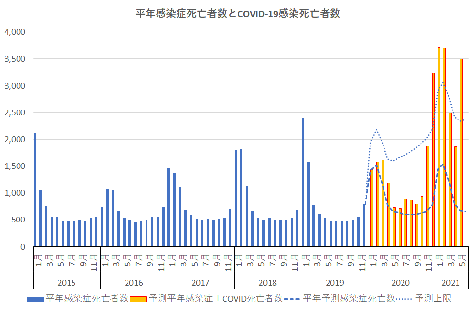 日本政府統計の窓口e-Statでは各種感染症による死亡者のデータベースが報告されている、残念ながら2020年度のデータはまだ無い。したがって2015年から2019年までの5年間の月間変動値から推定した2020~2021年5月までの死亡数にCOVID-19死亡数を加えた死亡者数をグラフにしてみた。