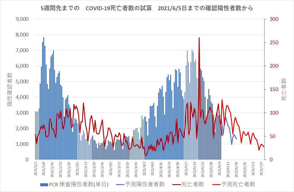COVID-19 感染死亡者数の5週間先までの試算 日本の場合