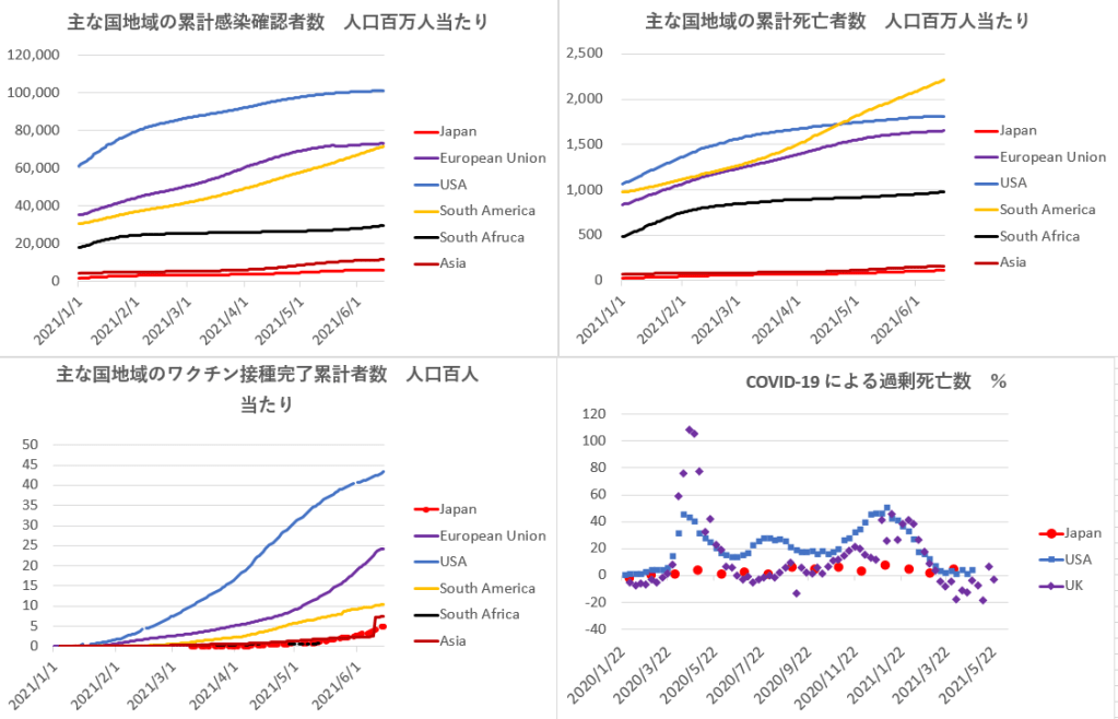 下のグラフは世界の国、地域の感染状況と日本とを比べたものである。赤色線が日本の場合で、何れの線もゼロ基線にくっついている。究極は下段右の過剰死亡者率である。この場合の過剰死亡者率とは、2019年以前の死亡数統計に比べ2020以降の死亡者増加率を調べ増加分をCOVID-19によると仮定した場合で、アメリカやイギリスでは無視できない値を示している。日本の場合はデータが不十分であるが、統計の信頼度から見て増加は見られない程度であることが分かる。どう見ても日本は感染被害を免れている国である。