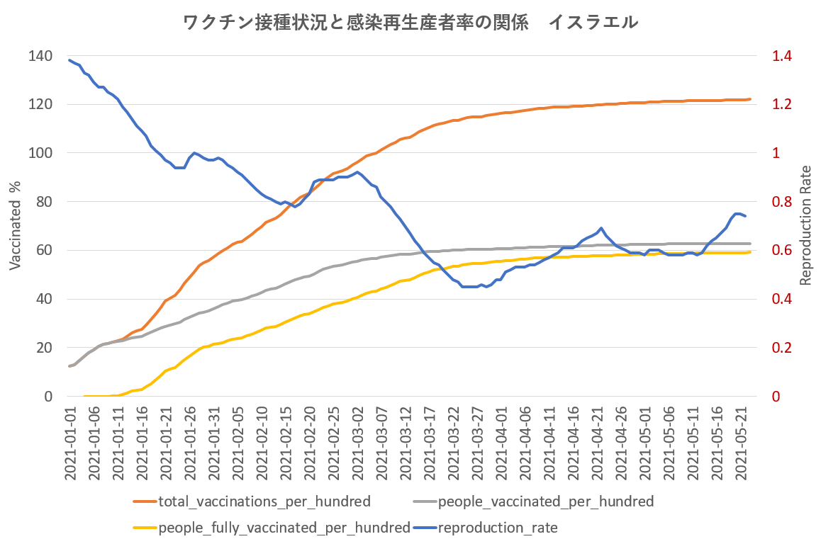 コロナワクチン接種の進み具合と感染者再生産率 イスラエルの場合