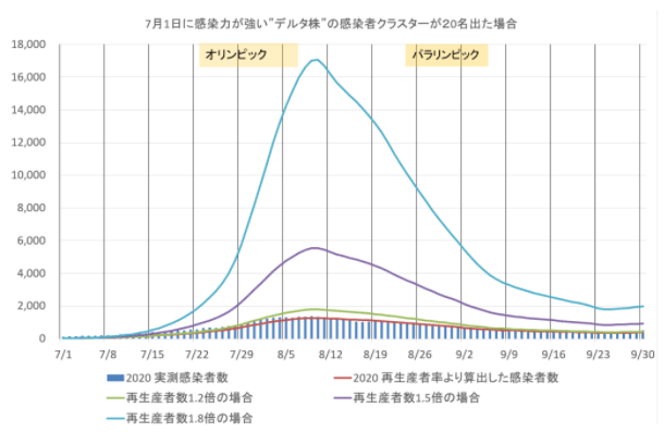 下は私が6月26日に私が試算しこのブログに書いた日本全国の感染者予想グラフを再掲したもの。私の場合は昨年の同季節の感染者変動を基準に、今年のオリンピック関連の新規感染者が7月1日に20名あったとした時の感染予測である。感染者が100%デルタ株の場合感染者数はオリンピック終了直後で最高1日1万7千も予想される、