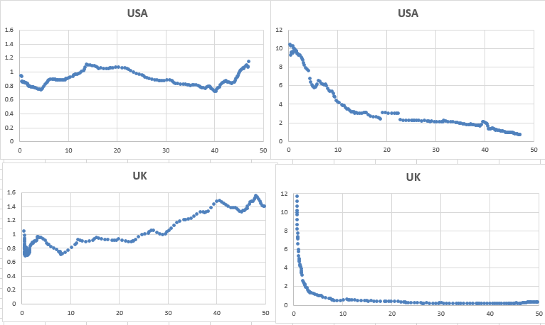COVID-19感染対策について大きく異なったアメリカとイギリスについて示したものが下の2段のグラフである。