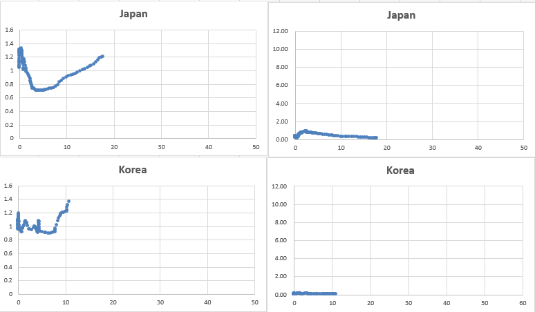 下の2段のグラフは、日本と韓国の場合で、ワクチンの接種率が欧米に比べ少ないにもかかわらず死亡者数は極端に少ない。