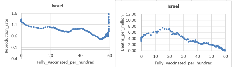 OWDのデータベースから、世界でワクチン接種率の最も高いといわれるイスラエルの場合について、感染再生産率(左)と死亡率(右)について描いたグラフである。