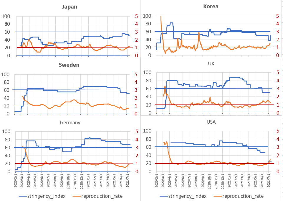 最も大きな特徴は、日本の政府規制が全期間を通し指数60以下で際立って弱いことである。特に第一次パンデミック初期でも再生産率2以下で、他の国々が3以上を記録し慌てて規制指数80近く、あるいはそれ以上の強行隔離手段(ロックダウン)を取って感染拡大を抑えた事と比べ、日本は規制指数40程度であったにも関わらず感染再生率は2以下であった。