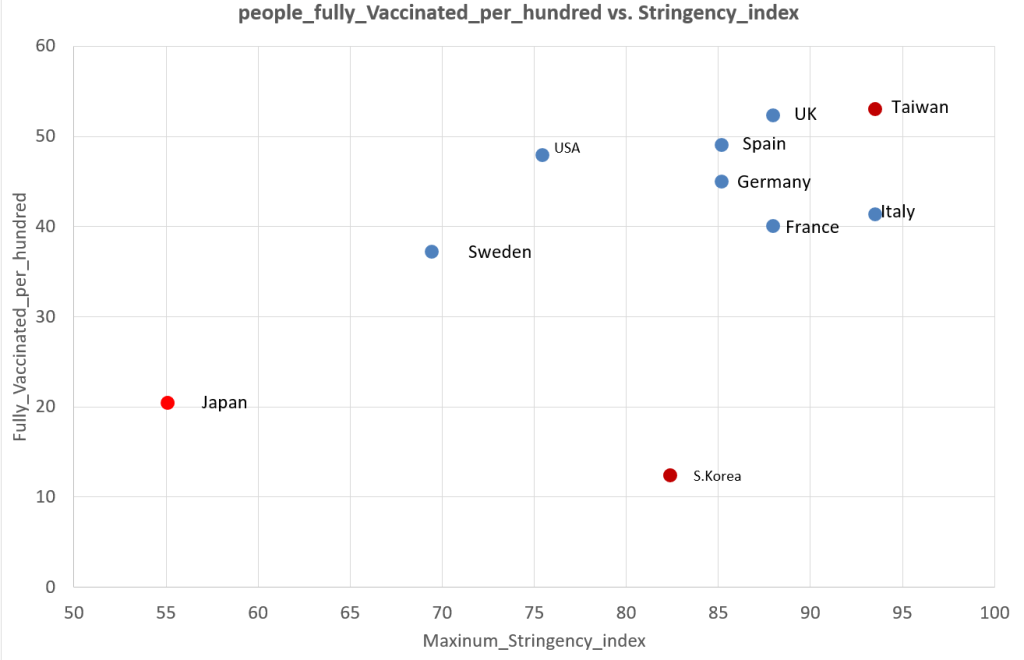 下のグラフは、ワクチン接種完成者数の場合で、この場合は政府の関与が影響しているとみてよいだろう。韓国は外れているが、比べたのはCOVID-19発生初期に戒厳令に等しい協力なロックダウンを実行したときのStringency値である。これと反対に台湾ではワクチン接種の強力な政策をとってた結果であろう。