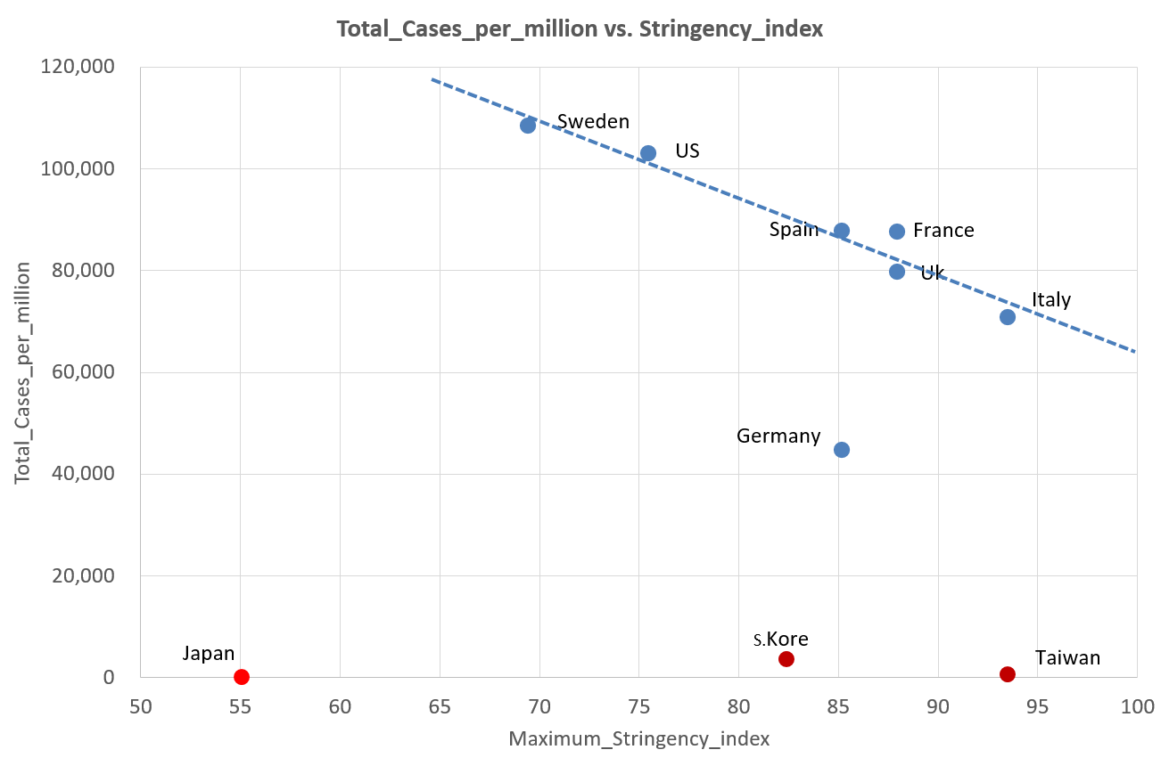 下のグラフは、人口百万人当たりの累計感染確認者数とその国での最も厳格な時期のStringency_index値の相関関係を示したもので、大きな特徴は極東アジアに位置する日本、韓国、台湾は政府の感染規制には関係なく際立って感染者が少ない。欧米諸国ではドイツを除いて見ると、国国の間では規制が強いほど陽性者率が減少していることが分かる。政策が十分機能しているかどうかの評価は別にして、一応まん延防止対策として成功しているように見える。