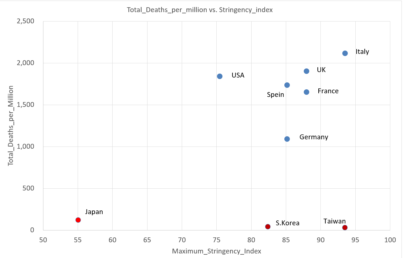 死亡者数についてみると、政府規制とは全く無関係で、防止効果は見られない。極端な例が、極東三国で、日本の最も規制の緩い。