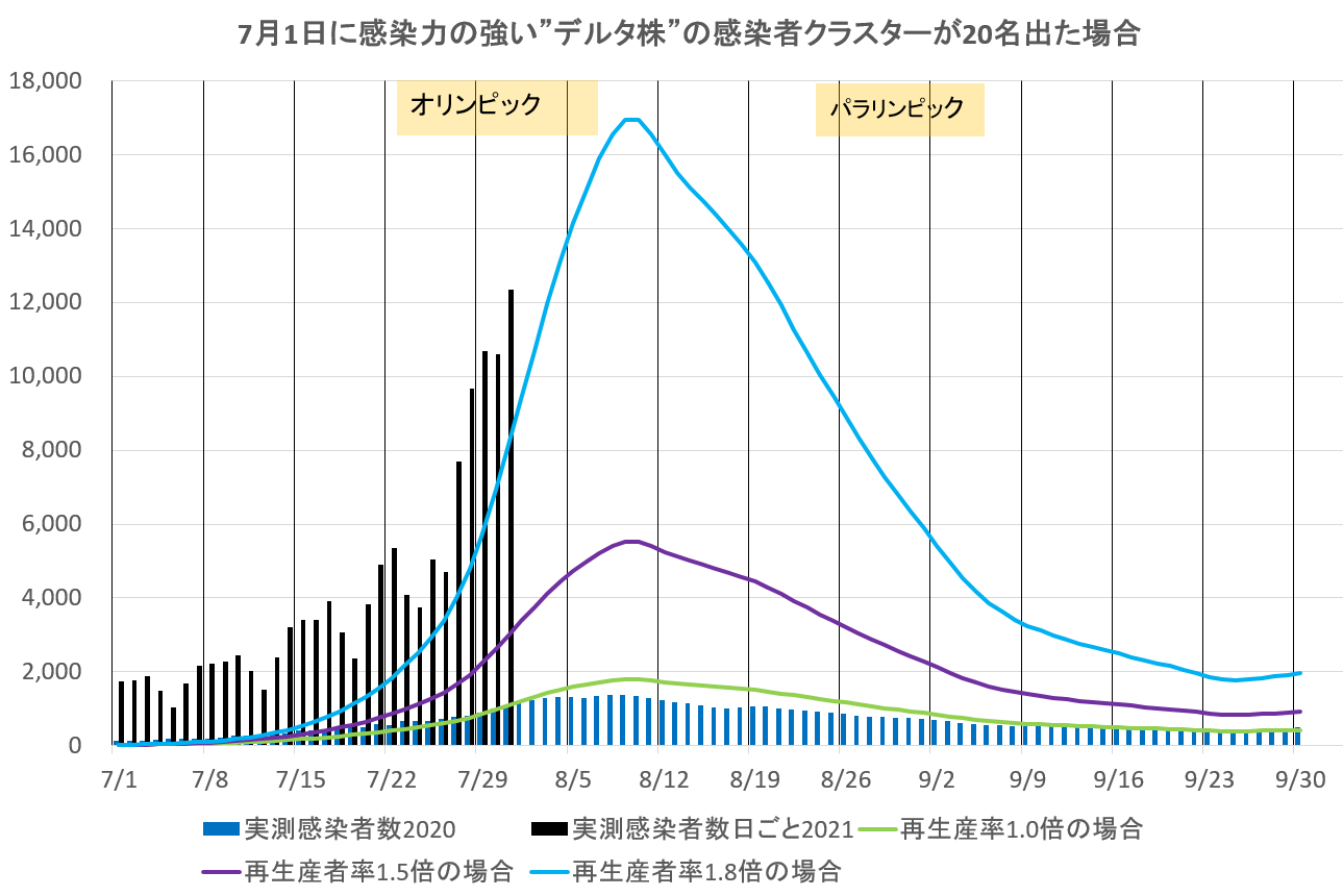 残念ながら実勢感染者数は、7月1日時点でデルタ株の感染率が1.8倍の最大予測を追っている。
