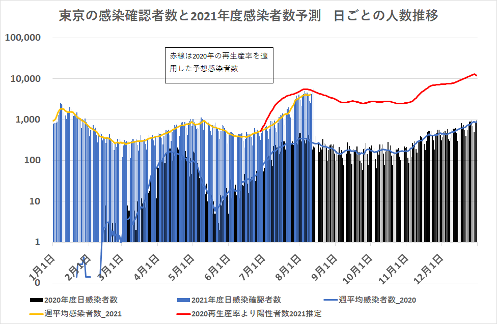 2021年7月から記入した赤線は、2020年の週間再生産率(reproduction rate )を用いて本年2021年の感染者数を推定したものである。この季節変動を根拠にした予測が公表されているデータに基づく推定の唯一の科学的根拠と思う。新しく発生している変異株のより強い感染率を計算に取り入れればここでの推定値は下限値といえるかもしれない。