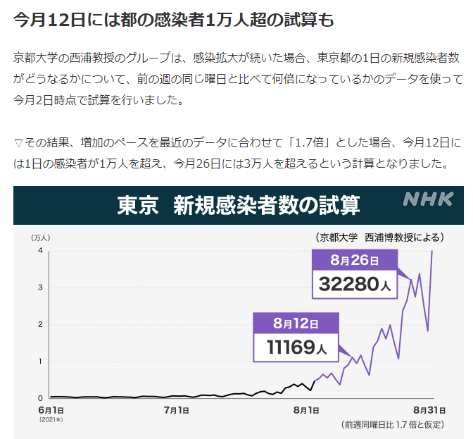 上のグラフを見ても確実なことは、実際の感染者数変動には波といわれる増減があって上昇局面の短期間で近似した指数関数的近似で限りなく感染者数が上昇することはありえない。下記の様なNHK記事の試算の根拠となる計算式を見たい。